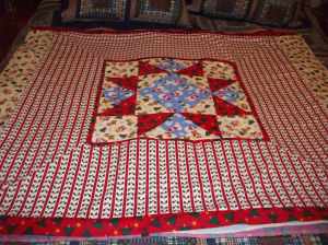 Have I mentioned how much I LOVE the rotary cutter? These are the pieces for the star block that is the center of the quilt. I changed my mind so many times while trying to figure out which fabric would be used for which shapes. In the end, I completely went off the reservation for everything except the star block. Below is how it’s supposed to look: