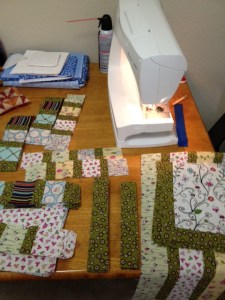 I know I’ve talked about it a little before, but what is on my mind right now is the Heidi Grace quilt that I’m putting together. Half of the panels are done and even though it’s slow going during the week, I’m still at it. Kay has a nasty cold that she’s been battling with lately and I’m not the best caregiver but I’m trying to take some of the dinner making and house cleaning duties off her shoulder while she gets well.