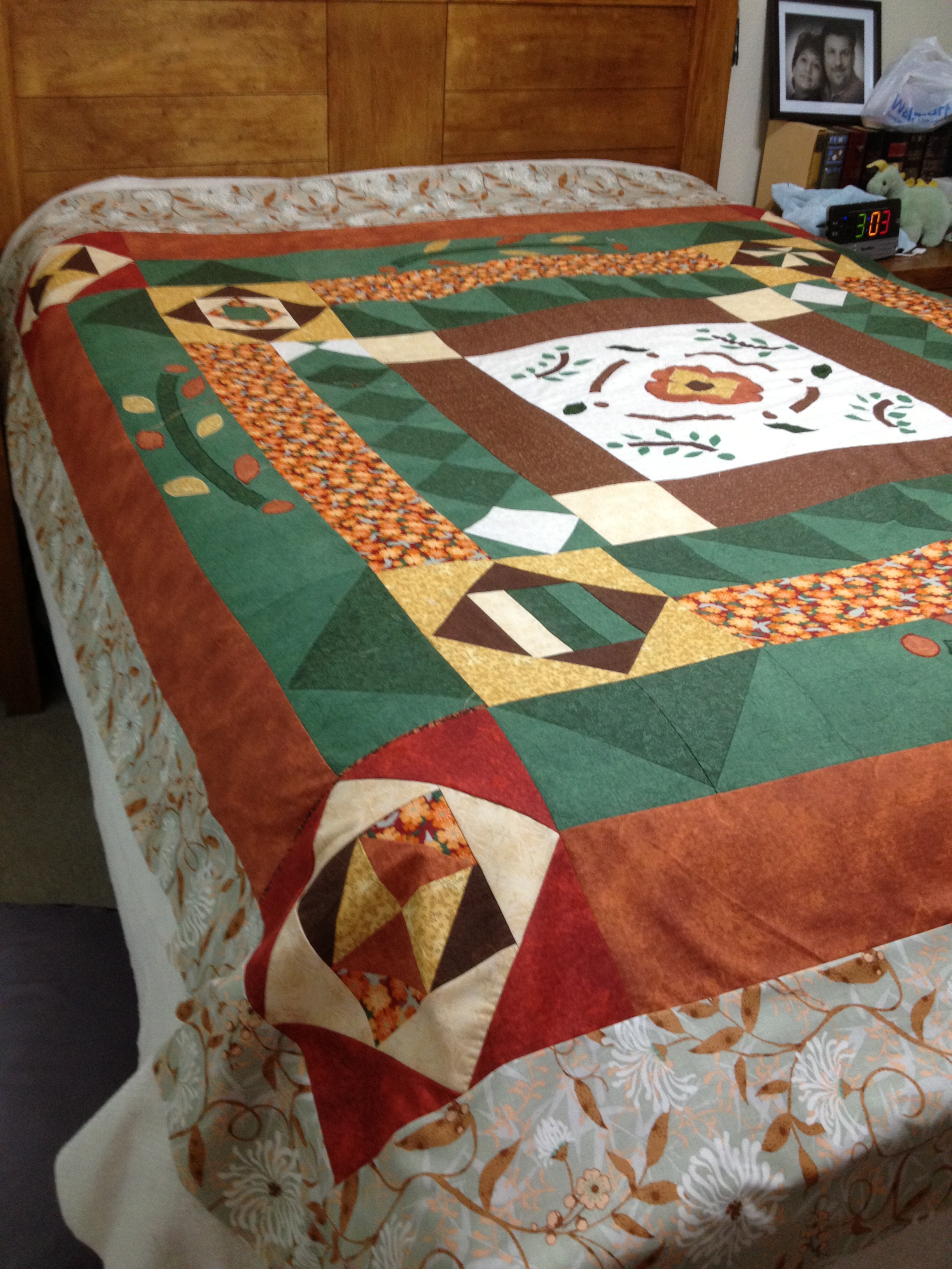 I’m so happy today that I was able to get accomplished the behemoth task of working late today and still managing to get the block finished and sew on the binding for my Arbor Lane quilt. Of course I’ve probably stayed up a little later than I normally would to make sure I could finish this. So here it is: