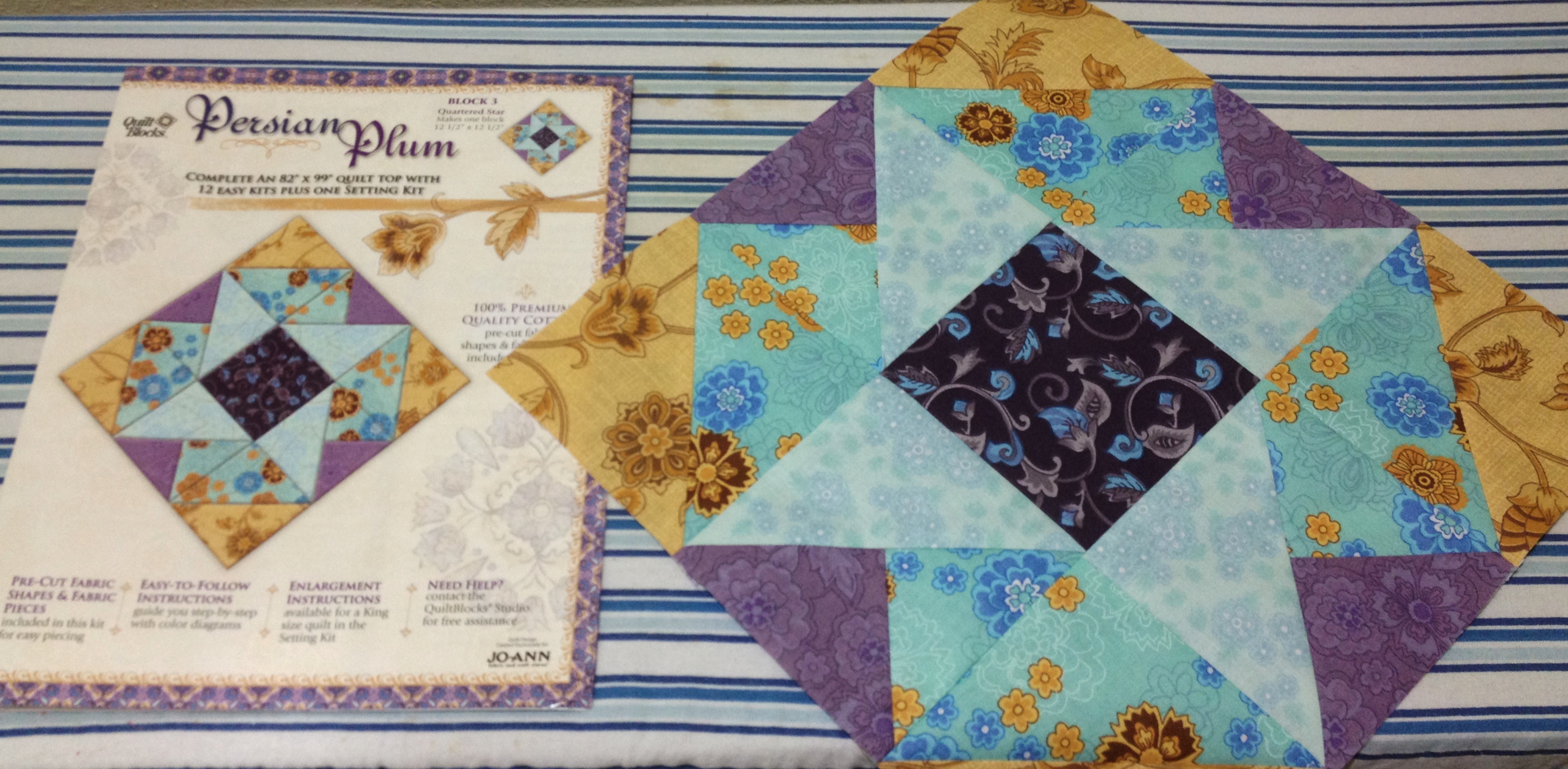 I’ve just completed block 3 from Joann’s Persian Plum which is called the “Quartered Star”.  This was a little more difficult than the previous two, made more so by the fact that I put three pieced together that didn’t belong.  Isn’t seam ripping fun???